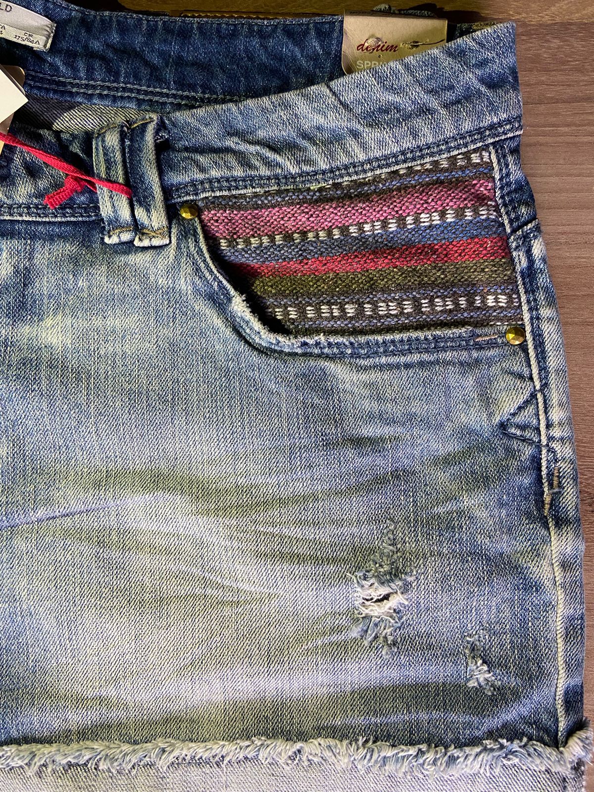 • Detalhes: 5 Bolsos, Fechamento de zíper e botão, detalhes de tecido bordado no bolso frontal, Barra dobrada.